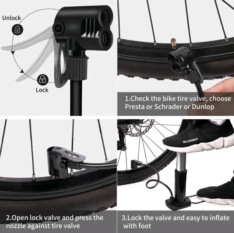 PORTÁTIL: La bomba de pie es fácil de almacenar, liviana y fácil de transportar. Se puede guardar en una bolsa para bicicleta. Viene con una boquilla infladora multifuncional, que es más práctica. El cinturón de aire desmontable hace que sea más cómodo de llevar. Se puede guardar fácilmente en el maletero de una bicicleta eléctrica. Diseño compacto y portátil para fácil transporte y uso móvil