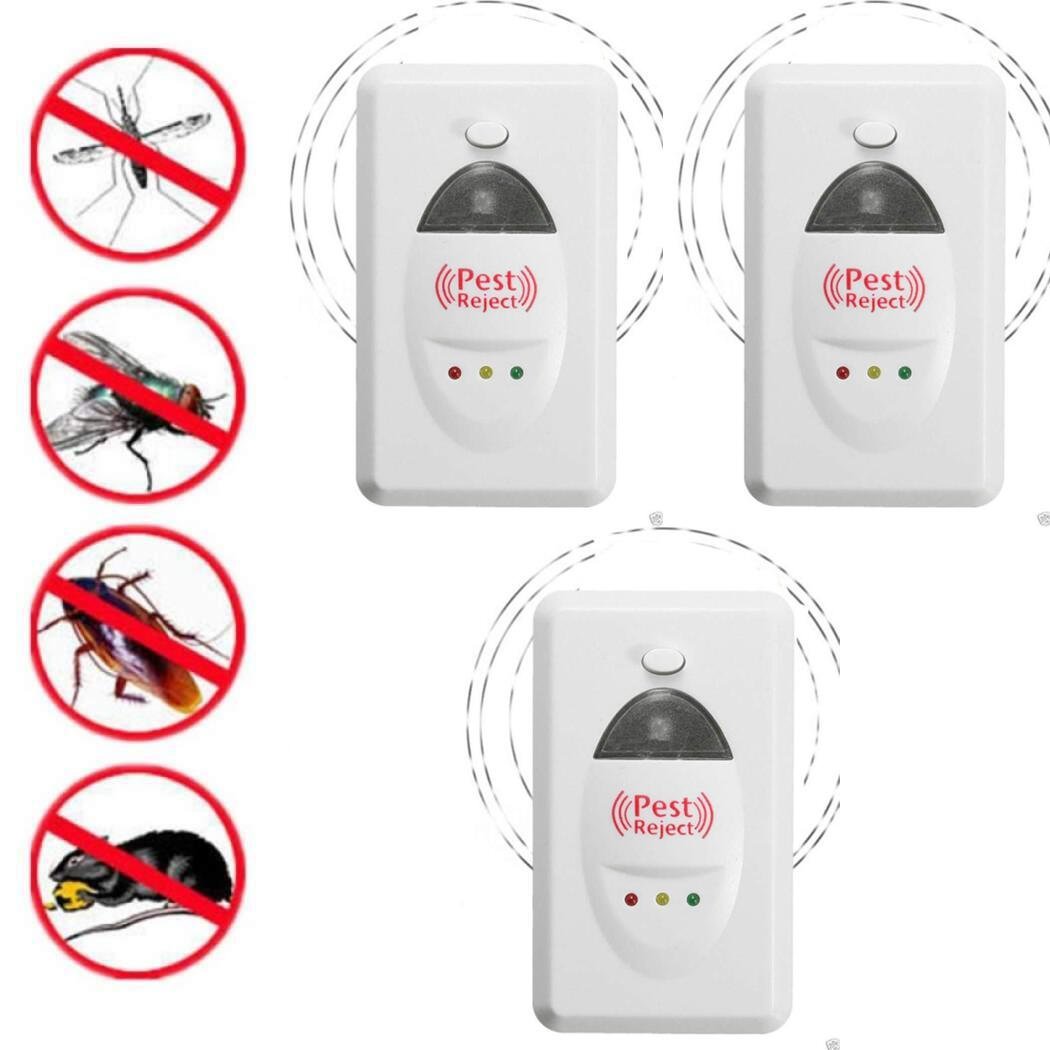 Pack de 3 piezas de Pest Control de alta tecnología para ahuyentar insectos y roedores. Utiliza una tecnología muy avanzada que aprovecha la red eléctrica de las paredes de tu casa, para enviar unos impulsos digitales electromagnéticos que ahuyentarán las cucarachas, ratas y arañas lejos de tu casa. Y además, como incorpora la tecnología de ultrasonido conseguirás hacer desaparecer las moscas y mosquitos. Así de fácil, Sin productos químicos, tóxicos o venenosos, y sin ningún tipo de mantenimiento. Repele toda clase de insectos y roedores. También combate los insectos voladores.