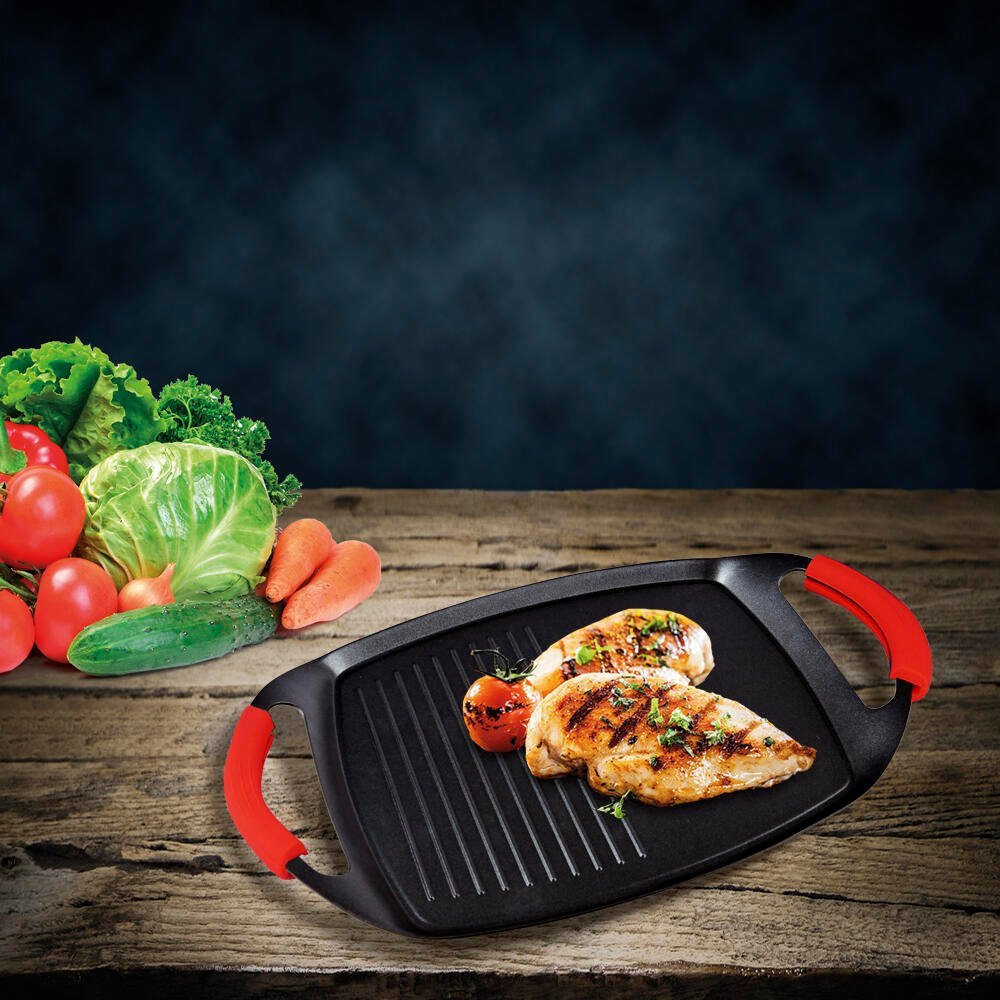 La plancha grill está fabricada en aluminio forjado, lo cual le permite proponer ligereza y rendimiento, con una base delgada apto para inducción que permite una distribución rápida y uniforme del calor