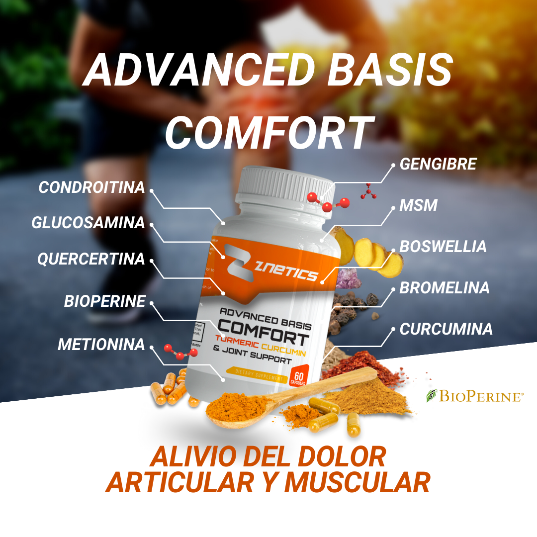 ZNETICS Advanced Basis Comfort Turmeric Curcumin & Joint Support ofrece una combinación potente de ingredientes diseñados para promover la salud articular y reducir la inflamación en el cuerpo, contribuyendo al bienestar general y la movilidad.